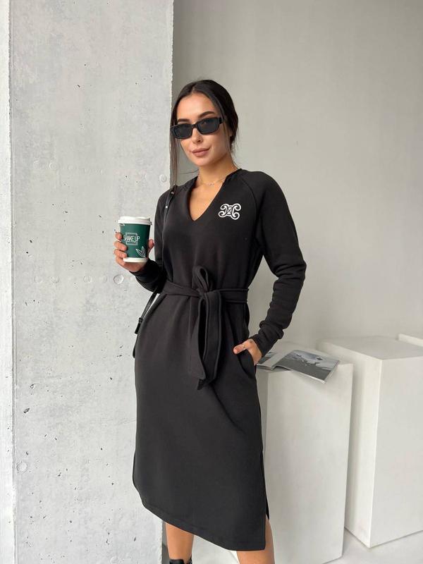 Сукня Модель рд 2072 Ткань трехнитка на флисе Размеры: 1(42-46), 2(48-52) Кольори: хакі, чорний, фуме Нашивка может несколько отличаться Есть два боковых кармана и разрезы с обеих сторон. Пояс в комплекті