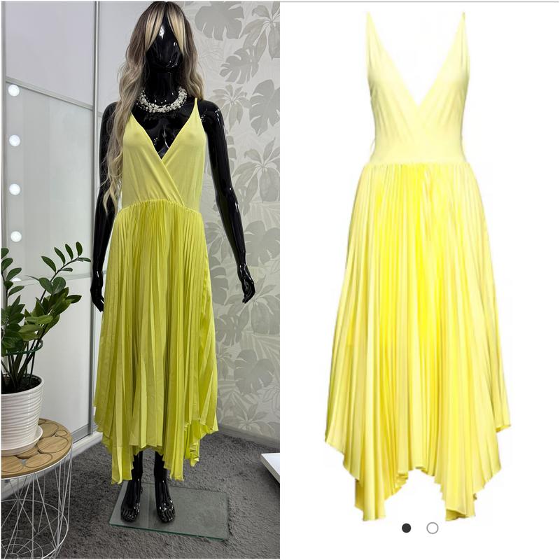 💛 Плісирована сукня від бренду Marciano Guess лимонного кольору, розмір L, нова з біркою. довжина 119 см, довжина до спідниці 37 см. груди 96 см, тягнеться до 105 см. талія 74 см, тягнеться до 90 см. стегна вільні, до 130 см. Сукня має підкладку.