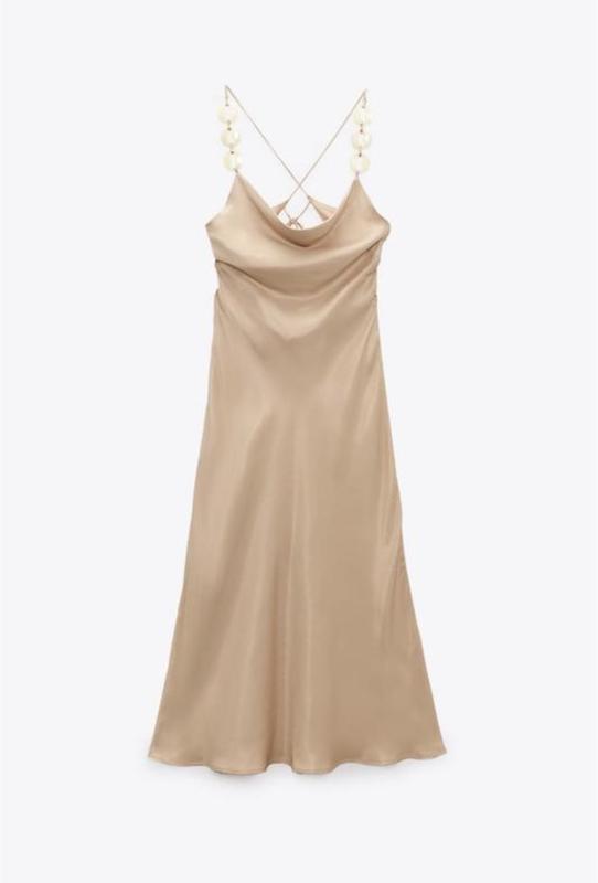 Плаття-комбінація від Zara на тонких бретелях, бежево- золотого кольору. Розмір L, на М також гарно сяде. Довжина від плеча приблизно 126-127 см, талія ПО 46 см, ПОБ 63 см, від подмишки до подмишки 46 см.