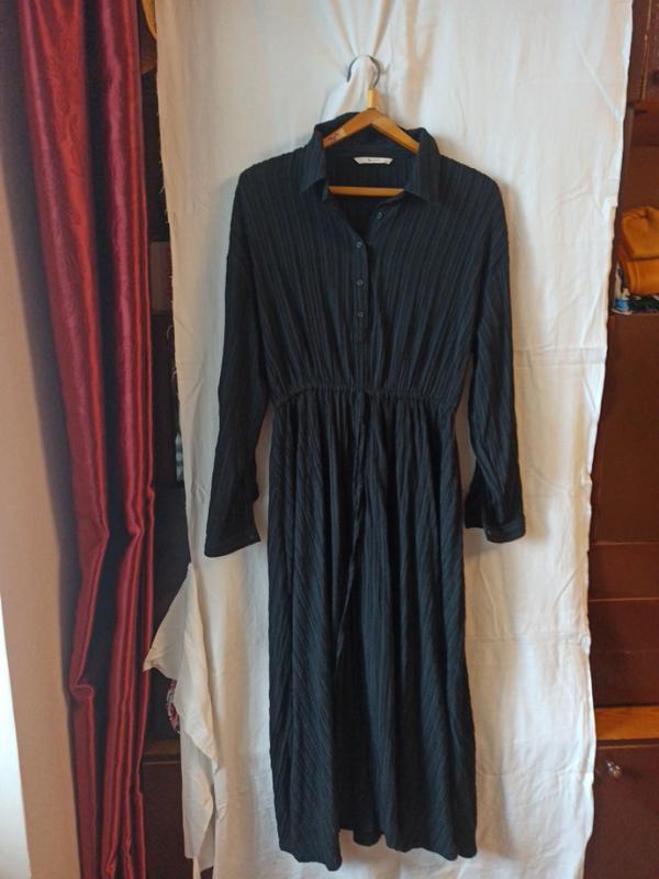 женское платье темно-синего цвета из фактурной ткани,. Состав: вискоза + полиэстер, ткань тянется.Верх имеет застежку на пуговицы, рукав спущен, пояс на резинке, руква можно регулировать клапаном. Ширина под рукавами 51 см, пояс в спокойном состоянии 36 см, длина 125 см. Продажа по полной оплате на карту.