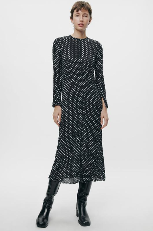 Платье в горошек средней длины с круглым воротником, жатыми вставками и длинными расклешенными рукавами с разрезами. Застегивается на скрытую молнию сзади. Состав: 100% вискоза.