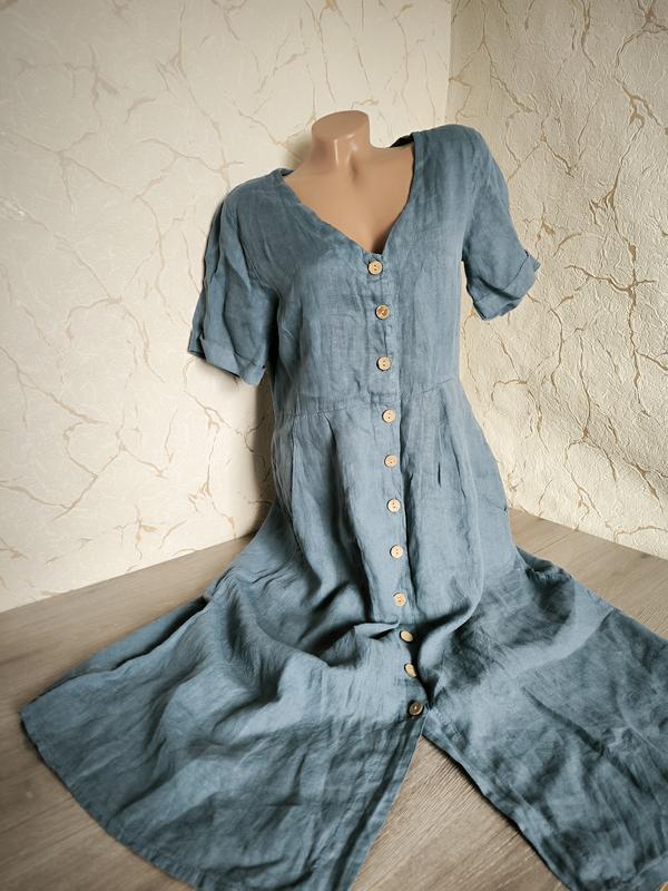 Льняное платье голубого цвета.Отрезное по талии,2 кошени.На последнем фото этимодель в другом цвете. Длина 40+74 Полуобхват груди 48 ПО талии 45 НО стегон 62 Плечи 41 рукав 22 Оплата повна. Безопасной оплатой не пользуюсь.