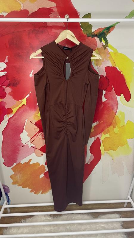 Поднимите свой образ на новые высоты с этим шоколадно-коричневым платьем миди с глубокими рюшами и драпированной талией. Представлена вам в шоколадно-коричневом материале. Совместите это платье макси с парой каблуков и золотыми серьгами, чтобы завершить образ, который нам сейчас нравится. Однотонный дизайн Длинные рукава с вырезами на плечах Рубашки на талии Облегающий крой