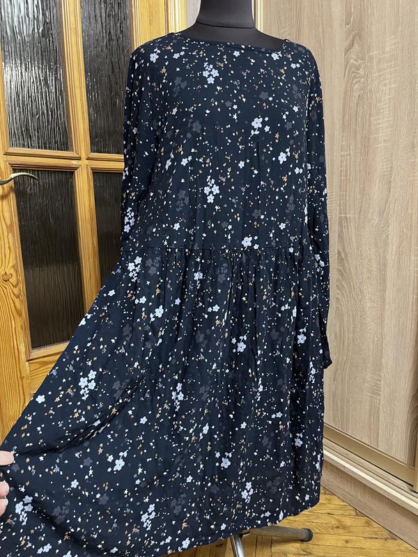 Темно синя сукня в квітковий принт, від талії вільний крій. Ідеальний стан. Віскоза. Без карманів Довжина 94 Напів обʼєм грудей 50,5 Рукав від шиї 70 В поясі 53