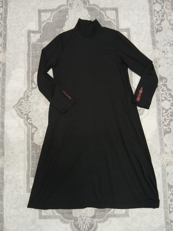 Одягала один раз. Вышивка на рукавчик не настоящая, а как наклеенная. Есть карманы. Крой свободный, ничего не передавливает. Длина от горловины до низа 103 см. Ткань приятная, но что-то искусственное, этикеток со составом ткани нет.