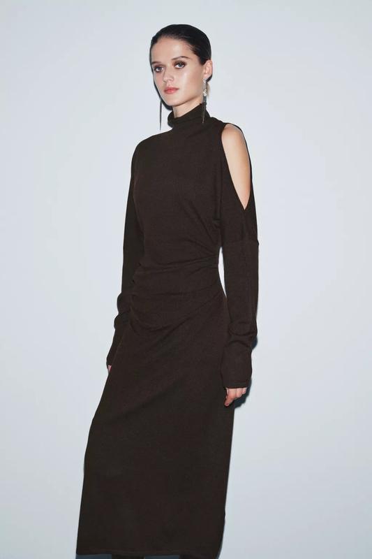 Однотонна трикотажна сукня з високим коміром і довгими рукавами з одним відкритим плечем. Зборки на талії. КОРИЧНЕВИЙ | 4938/124/700