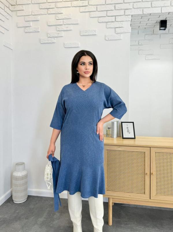 Платье впереди имеет два фигурных накладных кармана,фигурная горловина.(Без застежки).Рукав -три четверти.❤️❤️❤️ ✅ Качество -люкс!! Модель: 64 голубой Ткань:микровельвет(не тянется) 🔥🔥🔥 цена 495грн Размер:48-50 Замеры: 48-50 ОГ-106 см ОТ-104см Объем бёдер:110см Длина:107см