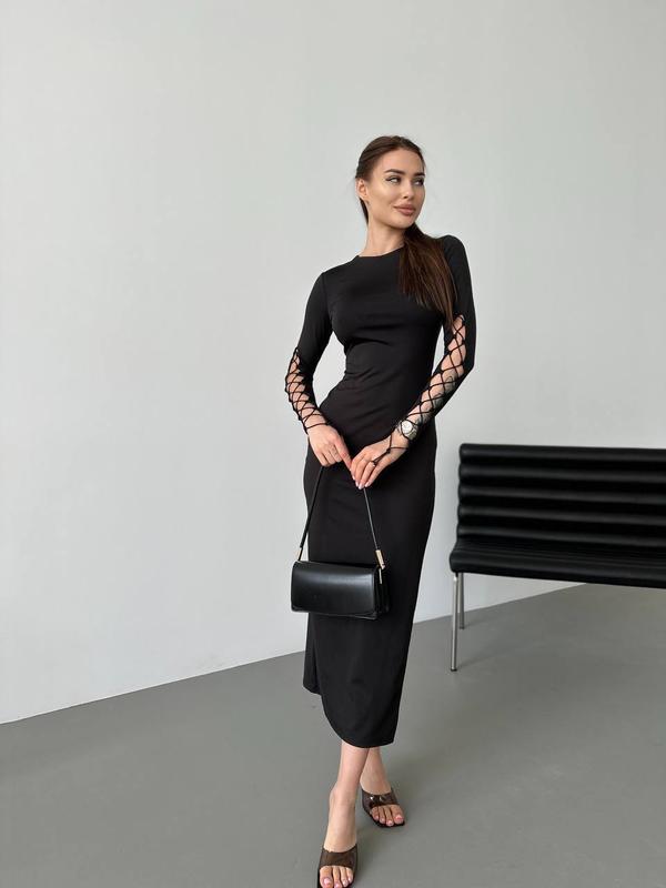 🖤Отримали 🖤 В большом количестве 🔥 Всегда в наличии 👍 Реальное фото # 507 ▪️Цвет: Черный ▪️Ткань: Плотный микродайвинг ▪Размер: 42-46 (единственный) Это хит продаж🖤Изящное сексуальное платье миди с разрезом и шнуровкой на рукавах👍Платье которое можно надевать шнуровкой вперед и назад 📸