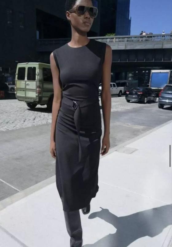 Нова стильна сукня-міді Зара з ременем. Тканина цупка, костюмна, трохи тягнеться. Позаду є розріз. Застібається на потаємну блискавку. Можна носити поверх футболки або сорочки. Розмір М НОГ - 46 НОТ - 37,5 НОС - 50,5 Довжина - 119
