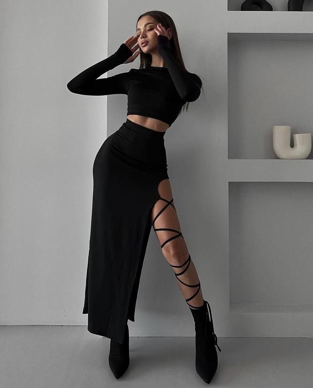 Комплект(спідниця+топ)❤️❤️ 🏷Ціна: 780 грн ▪️Мод: 711/121 ▪️Розмір: 42-46 (one size) ▪️Тканина: мікродайвінг ▪️Колір: чорний Дуже стильна сукня🔥🔥🔥🔥 📌Заміри 42-46: Топ: Довжина - 38 см Рукав від горловини - 73 см Груди - 80-98 см Спідниця: Довжина - 94 см Талія - 60-78 см Стегна - 90-102 см Тканина дуже добре тягнеться!