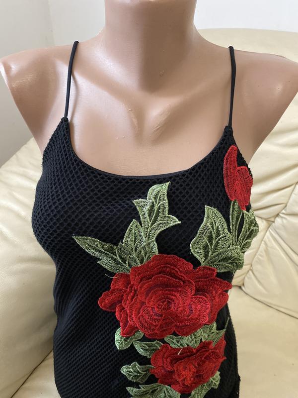 Продам облягаючу сукню-міді на тонких бретелях з чудовою вишивкою червоних троянд