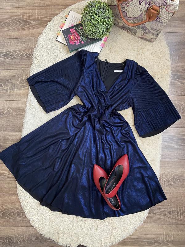 блискуча синя сукня розміру 46 ( маломірить, орієнтуватись на заміри) фасону на запах (wrap dress) з плісированими рукавами-дзвонами. Вона має V-подібний виріз та довжину міді. Темно-синій колір з металічним блиском, на запах, що створює А-подібний силует спідниці. Рукави довжиною 3/4, розширені до низу у формі дзвона, з плісированою текстурою. Сукня має блискавку на спині. Довжина 95см., півобхват грудей 50см., талія 42см., бедра вільно, низ 130см., довжина рукава від горловини 50см. Стан ідеальний.