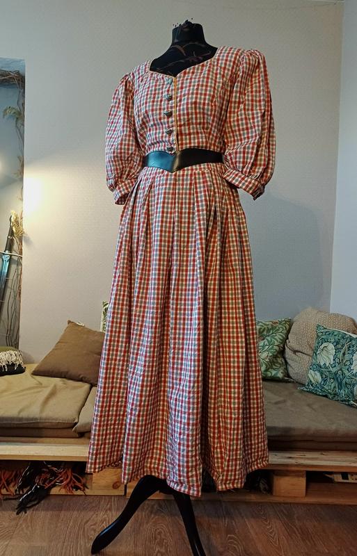 Роскошное винтажное платье из хлопка в красную клетку в австрийском стиле/в стиле cottagecore. Имеет пышную юбку, пуговицы-сердечки, рукав фонариком. Отлично будет сочетаться с рождественскими локациями через цветную гамму, из-за натуральности ткани - красиво сочетается и с зимними образами, и с летними (ткань дышит, очень приятная к телу). Гудзики металлические. Имеет отличное фигурное декольте. Низ будет еще более пышным с подюбником, можно еще соединить с корсетом для достижения силуэта. Подойдет на ОГ до 95см, талия до 80, в бедрах свободно. На манекене одето на параметры 90-70-80 Черный пасок приведен для примера и не продается.