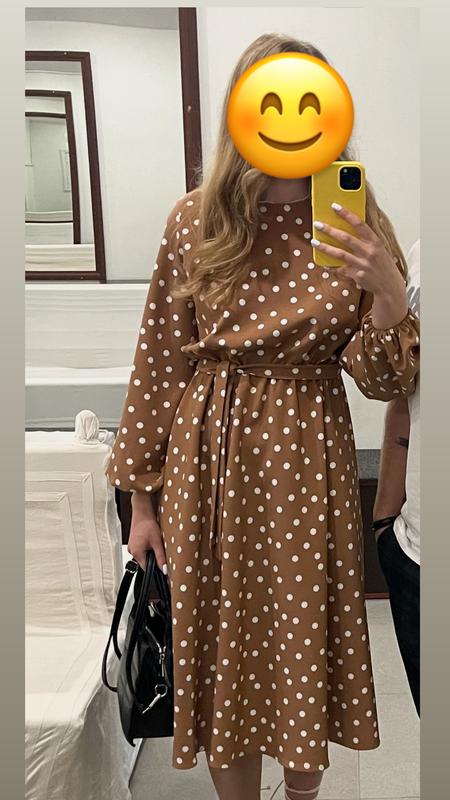 Коричнева сукня в горошок з поясом. Стан ідеальний. Розмір с-м. Мої параметри ог 85, от 70 об 98. Мій рімт 168. Але є ще запас. Український бренд, тканина цупка.