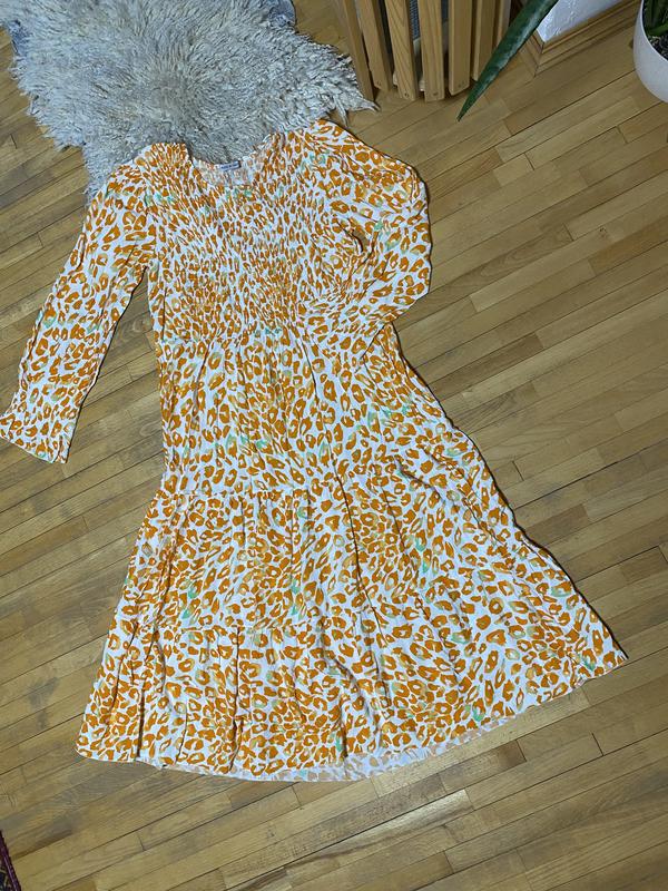 Ніжна та яскрава сукня Made in Italy з легкого, повітряного матеріалу. Має ефектний леопардовий принт у теплих відтінках помаранчевого з дрібними м’ятними акцентами — виглядає модно й дуже літньо. Верх виконаний зі зборками (smocked), що ідеально підкреслює талію та робить посадку комфортною. Довгі рукави, плавний розкльошений низ із секційними воланами створюють красивий жіночний силует. На останньому фото реальний колір ( яскравіший) Підійде для прогулянок, відпочинку, літніх поїздок чи яскравих casual-образів.