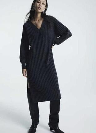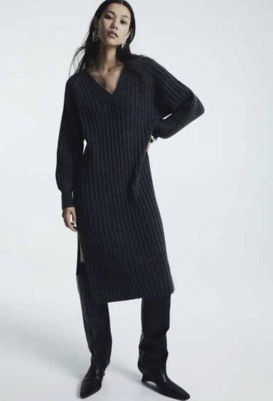 Платье прямого кроя длиной до икр.з ребристого трикотажа с добавлением шерсти.V-образный вырез, длинные, объемные рукава реглан с отделкой и прямой подол с разрезами по бокам. ПО груди 50-51см при необходимости тянется ПО бедер 50см при необходимости тянется Длина 112см Стан - идеальный Бирка с размером и составом срезана, на фото присутствует бирка состава с сайта