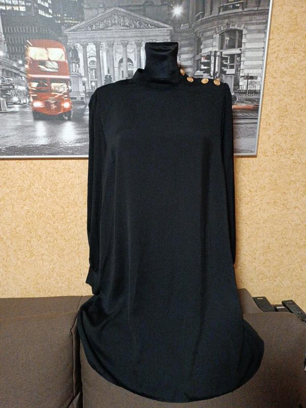 Платье женское черного цвета, прямое, свободного кроя. Застежка сзади, на плече декоративные пуговицы, рукав длинный присборенный на манжет. Замеры: ПОП-42см, ПОГ-60см, длина-93см, рукав-62см.