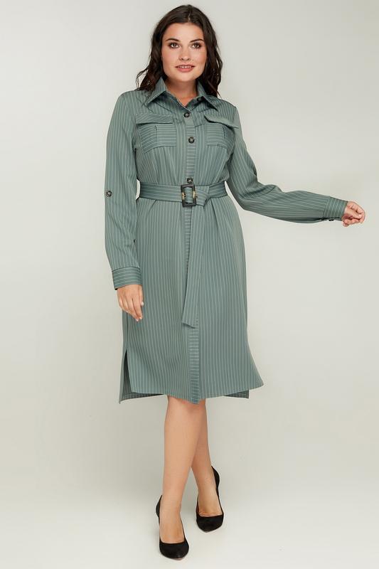 Сукня Василина. 400 Платье полуприлегающего силуэта с удлиненной спинкой. Рукав втачной на манжете на пуговицу с патом, с помощью которого можно зафиксировать рукав длиной 3/4. Воротник отложной на стойке. По центральному шву спинки-шліца. В верхней части полки расположен карман со встречной складкой и клапаном. На спинке-кокетка с поперечной полоской. По всей длине полки расположена планка с пуговицами. Две верхние пуговицы функциональные, другие декоративные. Линия талии может быть акцентирована поясом (в комплекте). Размер 54. Костюмная ткань (полиэстер 90%, вискоза 10%). 54 р-р: ОГ - 110см, ОТ - 108см, ОБ - 116см; ширина рукава - 40см; ширина манжети - 24см; ширина плеч - 40см;