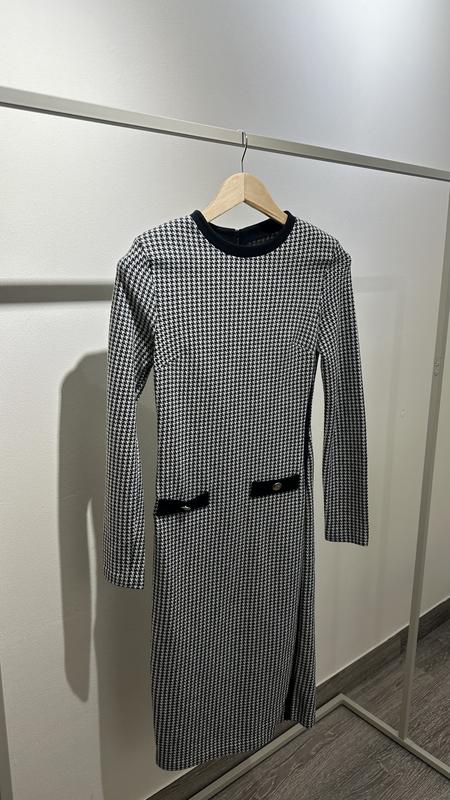 Ціна: 1000грн Це плаття-футляр від відомого італійського бренду Imperial ідеально підкреслить фігуру та стане основою елегантного образу для офісу, ділової зустрічі або вечірнього заходу. Принт: Класичний та завжди актуальний принт "гусяча лапка" (Houndstooth) у чорно-білій гамі. Фасон: Приталений футляр довжиною міді (до коліна або трохи нижче). Тканина: Щільний, якісний трикотаж, який добре тримає форму, не просвічує та комфортний до тіла. Горловина: Круглий виріз, оздоблений контрастною чорною трикотажною гумкою/кантом. Рукав: Довгий. Деталі: Дві невеликі накладні ( імітація) кишені спереду з контрастною чорною окантовкою та декоративною золотою фурнітурою/ґудзиками. Позаду — прихована блискавка для зручності. Невеликий розріз внизу (видно на фото) для комфорту руху.
