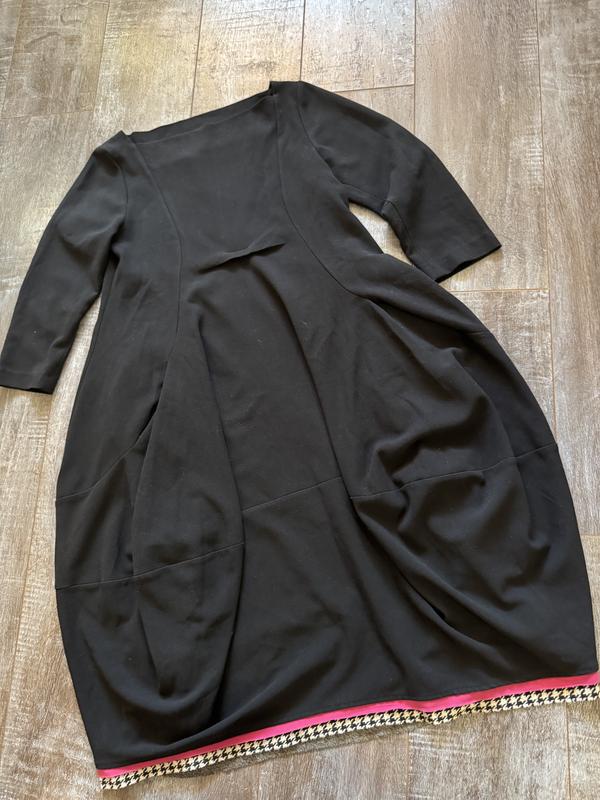 В ідеальному стані, дизайнерська сукня, Італія Заміри на фото Сукня має вільний, мішкуватий крій, характерний для стилів « lagenlook » або « бохо », з виразною лінією низу у формі тюльпана або кокона. По краю подолу проходить смуга яскраво-рожевої та чорно-білої тканини з візерунком «гусяча лапка», ці елементи роблять сукню унікальним предметом одягу, який поєднує класичний візерунок із сучасним, креативним дизайном