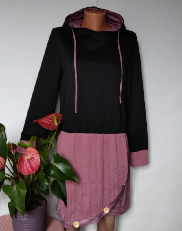 Бомбезное платье с капюшоном, комбинированная ткань, с одной стороны декорировано пуговицами. Карманов нет. Бирки со составом ткани отсутствуют, ткань не слишком плотная,, с небольшим начесом. Замеры: длина 89 рукав 62 пог 50-56 пост 50-60