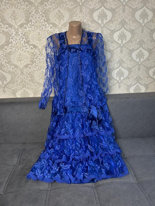 Ажурна жіноча сукня з накидкою Розмір L Заміри сукні: Довжина 120 см Напівобєм грудей 40 см заді резиночка еластична тягнеться до 50 см Заміри накидки Довжина 66 см Довжина рукава 57 см
