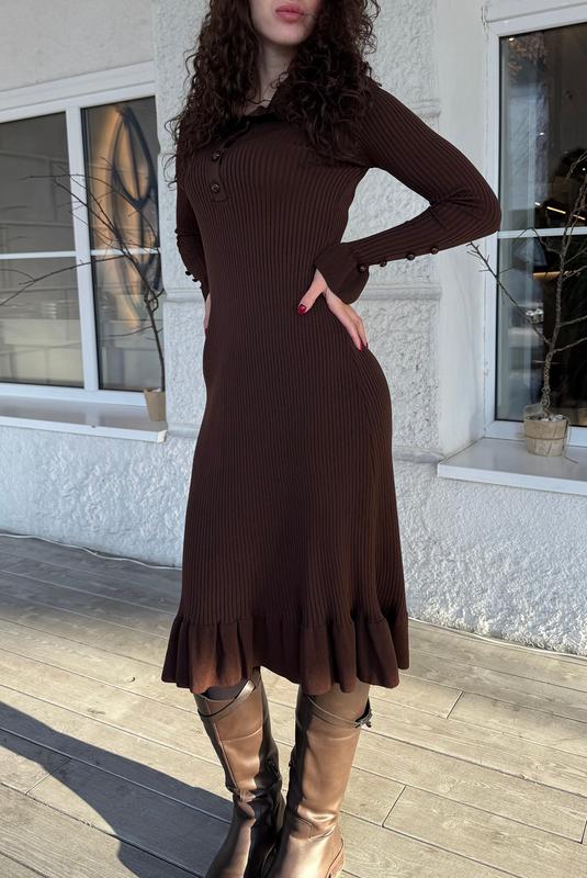 Трикотажное платье-миди с воланами Платье, которое делает образ элегантным и женственным. Миди-длина, красивые детали, воротник и пуговицы – все вместе создает очень женственный, классный силуэт. Она не обтягивает тело, а аккуратно подчеркивает фигуру - выглядит дорого и сдержанно. В двух универсальных цветах, которые легко подстраиваются под твой стиль и аксессуары. Размер: универсальный, подойдет на s, m, l Материал: 100% хлопок Цвета: черный, шоколад