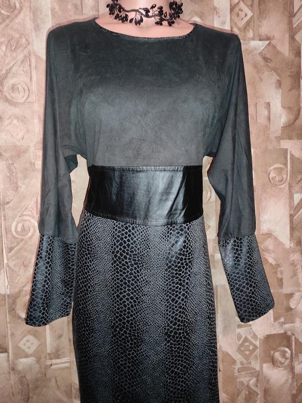 платье миди, пошито из 3х видов тканей: из мягкой ткани типа велюра, ткани под рептилию в пасок сделан из ткани под кожу; пояс можно завязывать как спереди так и сзади; сбоку есть незаметная молния платье подойдет на широкие бедра сверху в груди свободная, фасона "летучая мышь"; на меня платье неподошло, одевала пару раз, но оно на меня слишком большое в бедрах и в груди на мой 80D не ложится как Пасхи; может из-за роста + размера груди...линия черной ложится высоко, верхняя линия, вшитой вставки ложится высоко, не под грудью, а частично на их нижней четверти. Просто платье не на мою фигуру, хотя очень стильное и красивое без дефектов