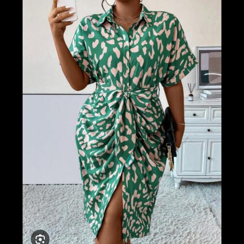 Зеленое платье-рубашка миди с абстрактным/леопардовым принтом и поясом.
