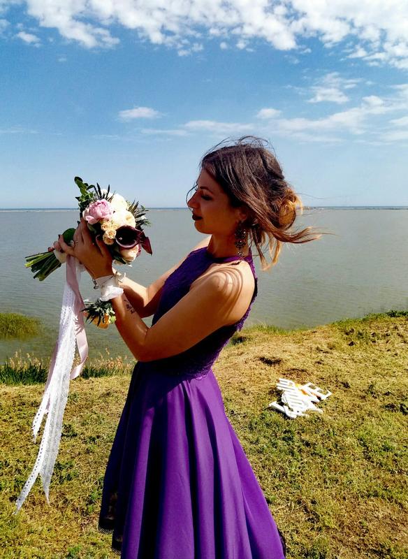 Елегантна фіолетова сукня для вечірки або випускного вечора. Шила на замовлення, одягала 1 раз на весілля. Створена, щоб підкреслити вашу красу та гарний смак. Готова допомогти вам виглядати неперевершено! Заміри топу видно на фото, Напівобєм талії 35 см, довжина юбки 42 (49 нижній слой тканини)