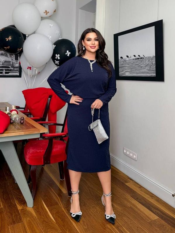 Сукня Модель No44один3-300/30 Размер: 50-52,54-56 Тканина: люрекс Цвет: синий 🏷️Цена: 765 грн. ✅Замеры: 🔹Размер 50-52 ог-112/116,от-80/90,ос-114/116,длина-131,рукав-70 🔹Размер 54-56 ог-120/124,от-90/100,ос-120/124,длина-133,рукав-70