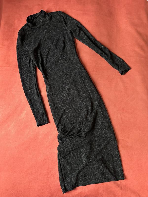 Стан нової без бірки. Ну дуже красива, ненавʼязливо сяюча, текстуру камерою не вловити. Красива чуть відкрита спинка. Особлива сукня, розмір хс, с, еластична, повністю на комфортній підкладці, довжина 118, ПОГ 36 і тягнеться, ПОТ 29, ПОБ 38, має сідати в супер обтяжку. Для зірки, не інакше