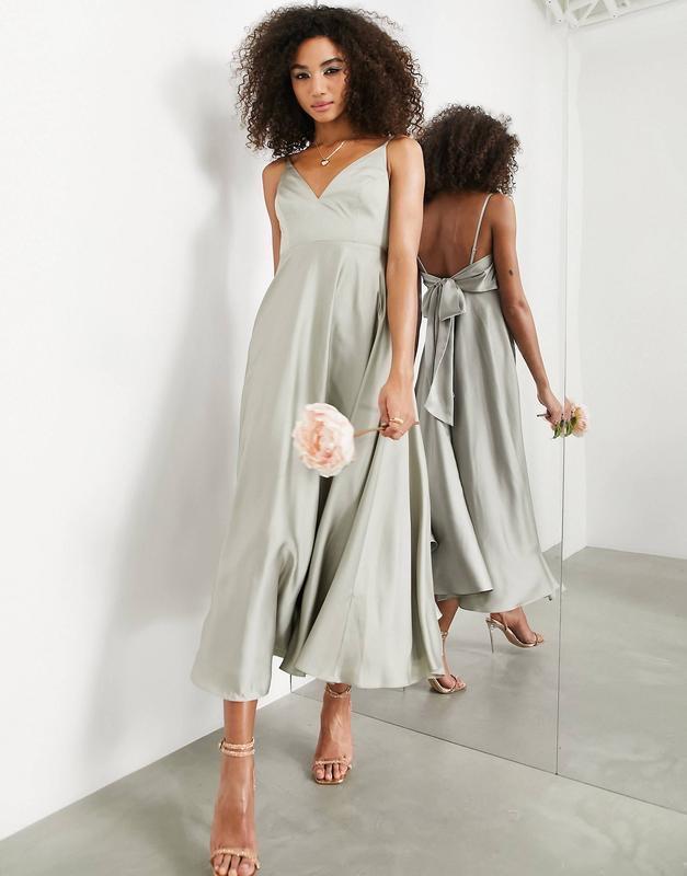 Атласна сукня середньої довжини ASOS EDITION із зав’язкою на спині шавлієво-зеленого кольору Розміри: 8, 10, 12 Довжина спереду без бретельок — 127 см