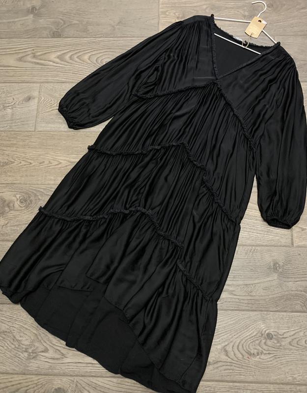 Шовкова міді сукня Be Trend Італія р. М/L/XL Сукня вільного крою (тому підходить на розміри М/L/XL), дуже красиво виглядає тканина. Склад: 30% шовк, 70% віскоза. Довжина по спинці від плеча 125 см Рукав 55 ПОГ 56