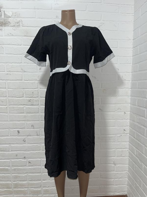 стан дуже добрий,нюанс вказала на останньому фото-трохи забруднилась біла тканина від чорної,але це майже непомітно,якщо не враховувати нюанс,то стан ідеальний.Тканина середньої щільності, трохи тягнеться,підійде більше на л,або на жіночку з невеликим бюстом,в мене бюст 105,в цій сукні випирає сильно напівобхват груди 49-54 напівобхват талії 42-46 напівобхват бедер 70 плечи 37-39 рукав 24 довжина 99