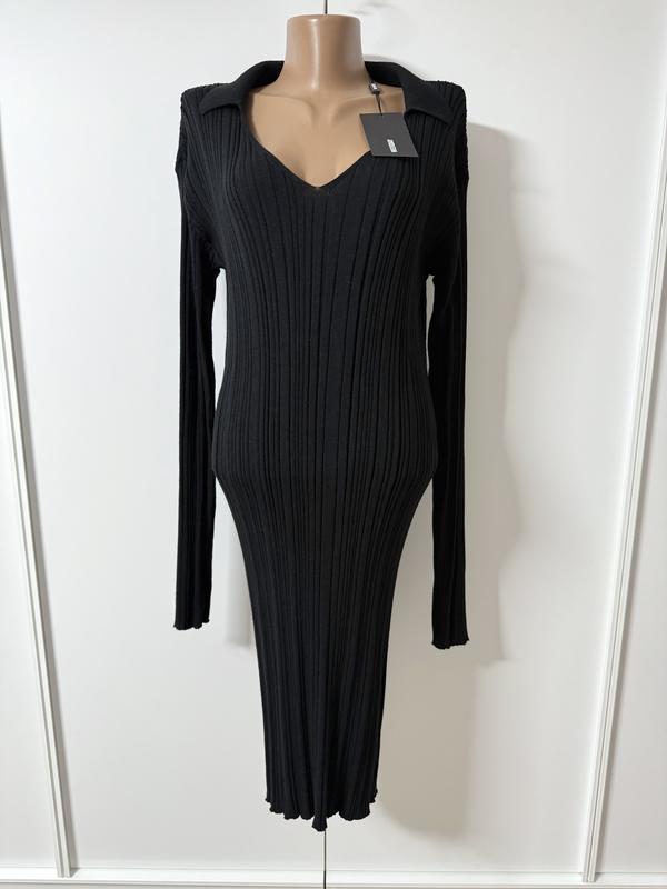 Класна сукня від Weekday вʼязка в мілкий рубчик, візкоза/поліамід Розмір пише М, гарно тягнеться і як на мене то краще L Нова