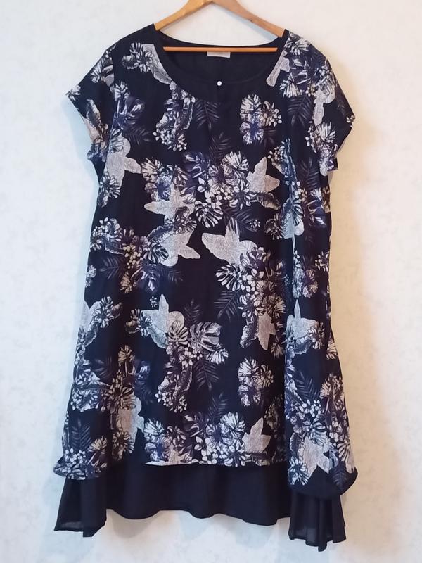 Платье, платье летнее из хлопка. Рукав- короткий. Платье двойное, на чехле. Прямой силуэт, для пышной дамы. В боковых швах кошени. Цвет: основное платье- синий+ белый цветочный принт, подкладка- синий. Ткань тоненькая, мягкая, не трикотаж, не тянется. Бавовна 100%. Замеры: пог- 64, поб- 68, длина- 112, рукав- 14, плечо- 10, спинка в плечах- 48.