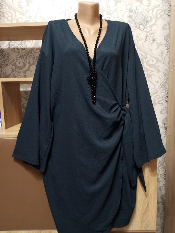 Новое, женское платье - кимоно, без каких-либо дефектов. Крой на запах, плечи приспущенные, рукав расклешенный к низу, застегивается на одну пуговицу с внутренней стороны и завязывается на бок с внешней стороны. Ткань средней плотности, жатка, красиво тянется, хотя полиэстр, но совсем не ощущается синтетики. Цвет темно-синий. Длина 97 см, плечи 55 см, пройма свободная, по бицепсу 21-22 см, пог 63 см (+-), пот 50 см (+-) регулируется завязками, поб 59-60 см (+-).