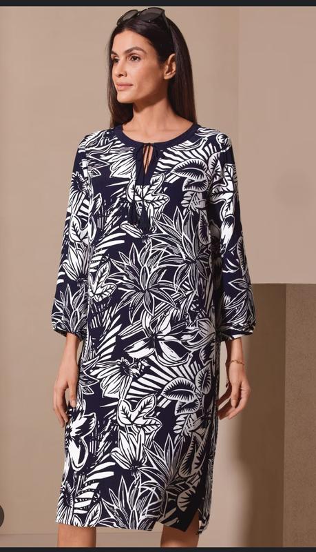 состояние новой вещи. ткань вискоза, спереди застежка крючок. приятная ткань, внизу небольшие разрезы по бокам и вставка синего цвета. замеры длина 110, ширина 58, прямая, между плечами 42, рукав на резинке 53., разрезы внизу 10