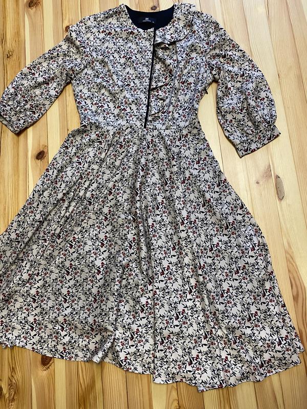 Надзвичайно гарне і ніжне плаття,в молочному кольорі в квіточку, дуже ніжна тканина, збоку замочок,спереді воланчик, півобʼєм грудей47-48,по поясу35-36,довжина рукава44,довжина плаття 108-110