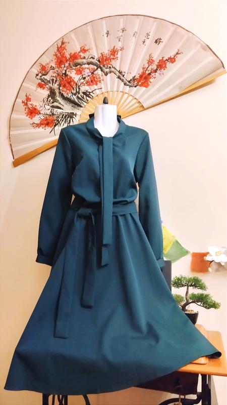Великолепное платье, одновременно романтичное и деловое. Бант можно завязывать по-разному, пояс идет отдельно, его можно убрать. На талии резинка. Спереди застегивается на кнопки, на рукавах тоже кнопки (одна надо зафиксировать). Вне того, состояние идеальное, приобретало новую, одевала 1-2 раза. Украинский бренд.