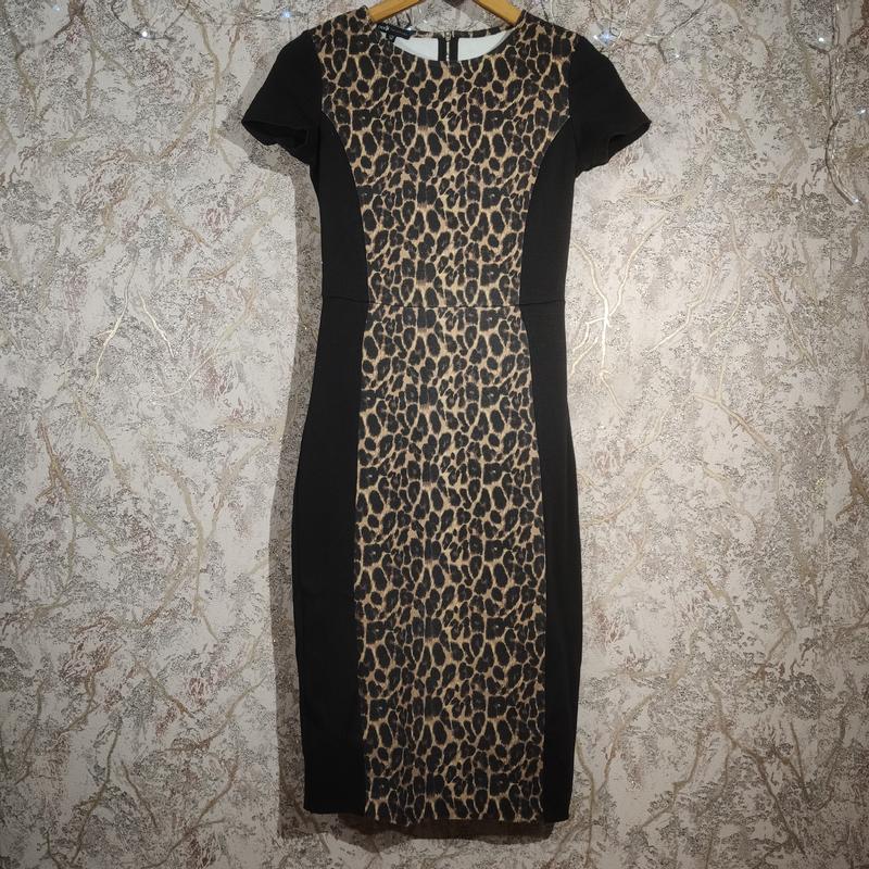 Платье по фигуре с леопардовым принтом. Рукав короткий, материал эластичный, сзади сверху молния. Размер на этикетке: 170/36 Замеры в покое: НОГ 39см НОТ 33см НОС 42см Длина 100см Изнутри есть небольшие катышки, снаружи гладкая.