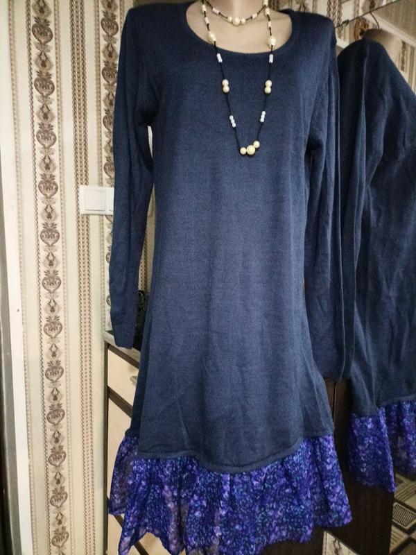 Красивое Нарядное платье трикотаж, цвет темно синий, по низу широкий штионовый рюш с цветочным принтом. Пошила свободная. Объем груди 100 -112 см, длина 100 см, бедер до 114 см,, рукав 68 см. Оплата продавца на карту.