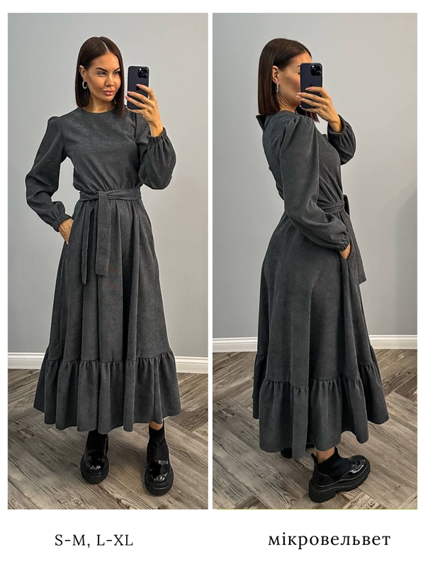 Стильное платье миди из мягкого микровельвета – это сочетание комфорта и элегантности, которое подходит как для повседневных выходов, так и для особых моментов. Платье дополнено поясом, что выгодно подчеркивает фигуру и акцентирует талию, а длинные рукава с легким объемом и эффектный волан по низу юбки добавляют образу элегантности. Ткань приятная к телу, держит форму и дарит ощущение уюта в течение всего дня. Преимущества микровельвета: Комфортный в носке, не раздражает кожу. Уютный и теплый, но не перегревает. Эффектно смотрится – создает благородную текстуру. Подходит для повседневных и нарядных образов. Хорошо сидит на фигуре, подчеркивает линии тела. • Цвет – графит (как на фото) • Размер - S-M, L-XL • Ткань - микровельвет • Параметры модели - 88*62*90 рост 170 см • Страна - Украина Замеры смотрите на последнем фото. Перед оформлением заказа УТОЧНЯЙТЕ наличие товара! ЗВЕРТАЄМО УВАГУ! Цвет изделия на фото может отличаться от цвета фактического товара, что связано с искажением цветопередачи Вашим монитором, настройками фотоаппаратуры и другими факторами.