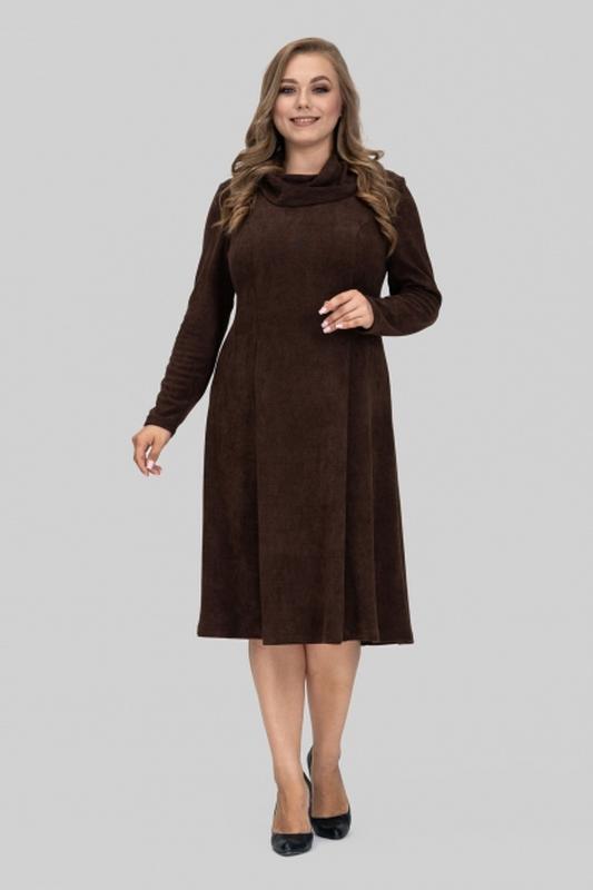 Платье полуприлегающего силуэта. От линии талии расклешенная к низу. Выполнена из плотного трикотажа, имеет мягкую, бархатистую структуру, высокую эластичность. Рукав втачной, одношовный. По полочке и спинке выполнены рельефные швы. Воротник хомут. .50: ОГ - 100см, ОТ - 90см, ОС - 110см; ширина рукава - 19см; ширина спинки - 37см; ширина манжети - 11см; р.52: ОГ - 104см, ОТ - 96см, ОС - 116см; ширина рукава - 19см; ширина спинки - 38см; ширина манжети - 11см; р.54: ОГ - 110см, ОТ - 102см, ОС - 124см; ширина рукава - 20см; ширина спинки - 39см; ширина манжеты - 12см; р.56: ОГ - 114см, ОТ - 106см, ОБ - 130см; ширина рукава - 20см; ширина спинки - 40см; ширина манжеты - 12см; р.58: ОГ - 118см, ОТ - 112см, ОБ - 136см; ширина рукава - 21с ширина; спинки - 41см; ширина манжеты - 12см; р.60: ОГ - 122см, ОТ - 116см, ОБ - 142см; ширина рукава - 21см; ширина спинки - 42см; ширина манжеты - 12см;Довжина рукава: 60см; Длина изделия по спинке: р.50,52 - 110см, р.54,56 - 114см, р.58,60 - 117см;