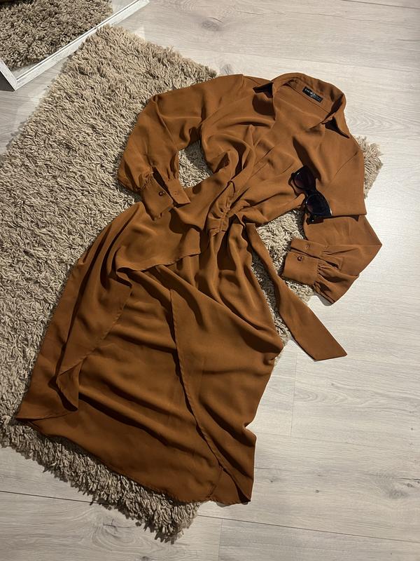Шикарна сукня-міді коричневого кольору на запах з довгим рукавом❤️