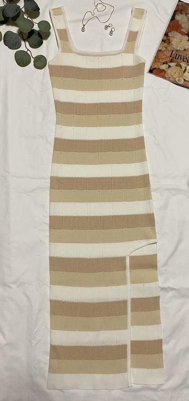 Шикарна вʼязана сукня міді без рукавів тілесного кольору.Виготовлена з еластичної вʼязаної тканини для максимального комфорту,ця сукня має шикарний квадратний виріз на грудях та модний розріз по нозі.Нейтральний візерунок у смужку,додає грайливості.Ідеально підходить для літніх вечорів Довжина-114 НОГ-33 Розмір 8-10 На фото модель зі зростом 170 70%віскоза 30%нейлон