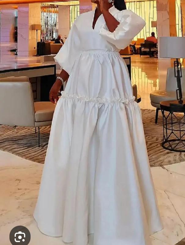 Это белая миди-платье с многоярусной юбкой и рукавами-фонариками. Она имеет V-образный вырез и собранную (усборенную) талию на эластичной резинке, создающей свободный, струящийся силуэт.. По наборке нет размер поэтому ординироваться на замеры. Замеры : об/грудь 105, об/талия 80, об/бедра свободные, длина 140, рукав от шеи 61. Имеет резинку на талии
