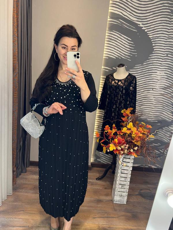 нарядное и сказочно красивое миди-платье безупречного черного цвета из креп-шифона жатки – легкое, воздушное и по-настоящему праздничное, ткань красиво играет при движении, мягко струится и подчеркивает фигуру без лишней обтяжки, интересный рукав 3/4, карманы по боковых швах и изящный вырез на груди в обрамлении белоснежных жемчужин добавляют элегантности, а главное - платье щедро украшено жемчугом, большими камнями и серебристыми стразами, которые делают платье идеальным для праздников, важных встреч, торжеств – там, где нужно выглядеть безупречно и собирать комплименты размеры 50 52 54 56 58 в зависимости от размера длина 120-128 см, объем груди по изделию 114 + 4 до 132 см хорошо садится на параметры от 110 до 132 см, длина рукава 62-65 код Р 28