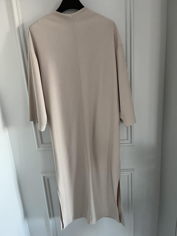 Стильне плаття в рубчик з високою горловиною та четвертним рукавом .Розмір вказаний xs,підійде на s та невелику m